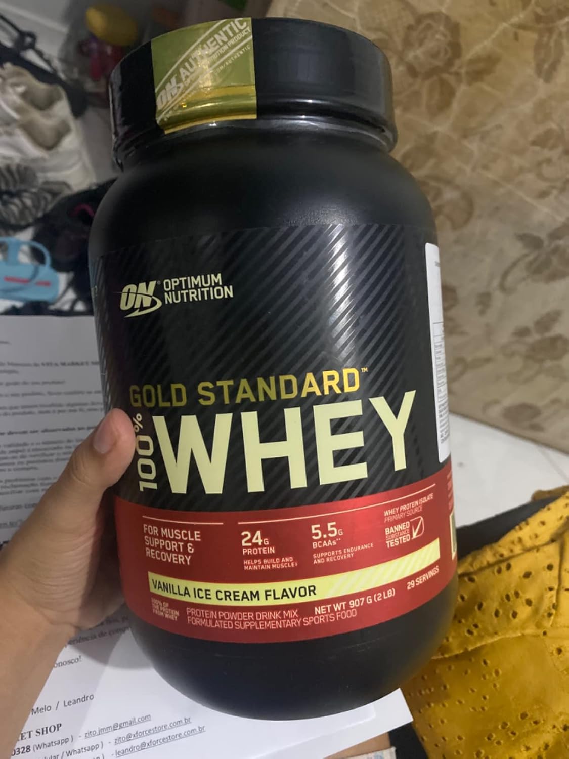 O Whey Protein Gold Standard da Optimum Nutrition é um suplemento em pó de 909g, sabor Vanilla Ice Cream, referência mundial em proteína premium.