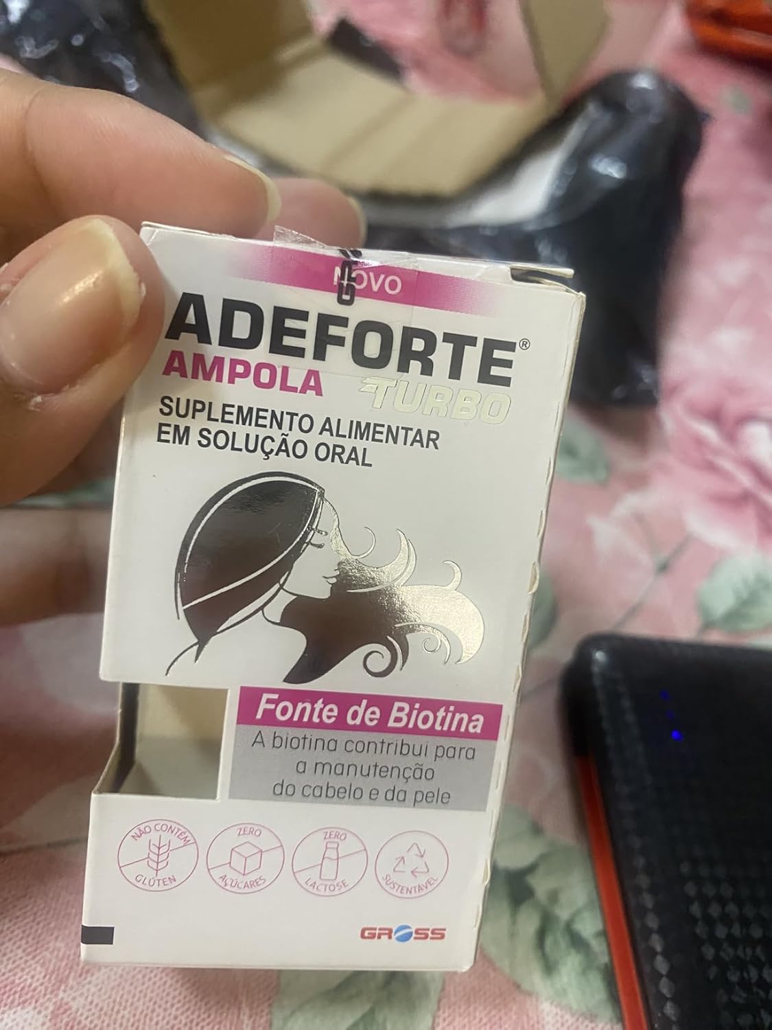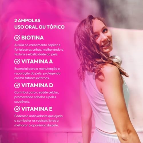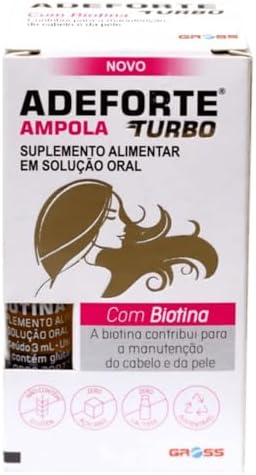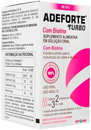 Adeforte Turbo + Biotina 3ml | Vitaminas A+D+E | Crescimento Capilar | Fortalece Unhas e Pele | Original Gross O que é: Suplemento vitamínico de alta absorção, combinando A/D/E e Biotina. Benefícios: Estímulo ao crescimento saudável dos fios. Prevenção de queda, prevenção do envelhecimento precoce. Suporte ósseo e imunológico. Como usar: Quebre e consuma separadamente as ampolas em colher, 1 hora antes da refeição, conforme bula ou orientação profissional. Composição resumida: (Ex.: “Palmitato de retinol, colecalciferol, acetato de racealfatocoferol e Biotina.”) Atenção: Contém derivados de amendoim. Não indicado para gestantes, lactantes, crianças.