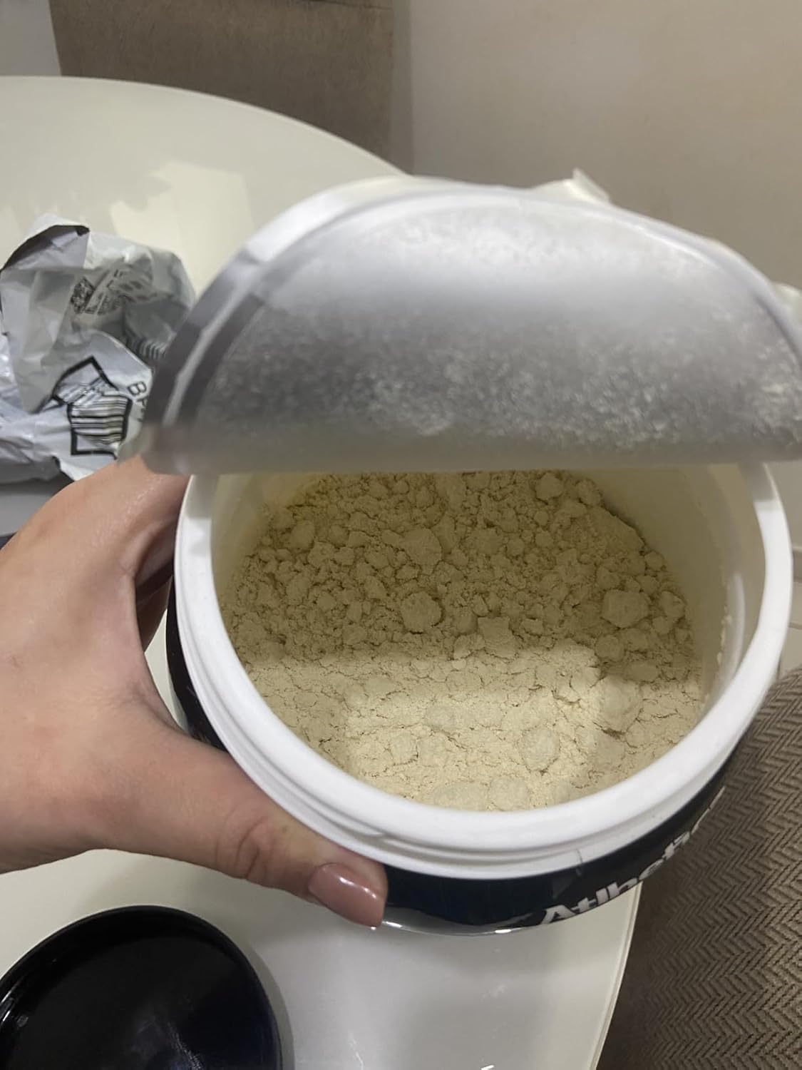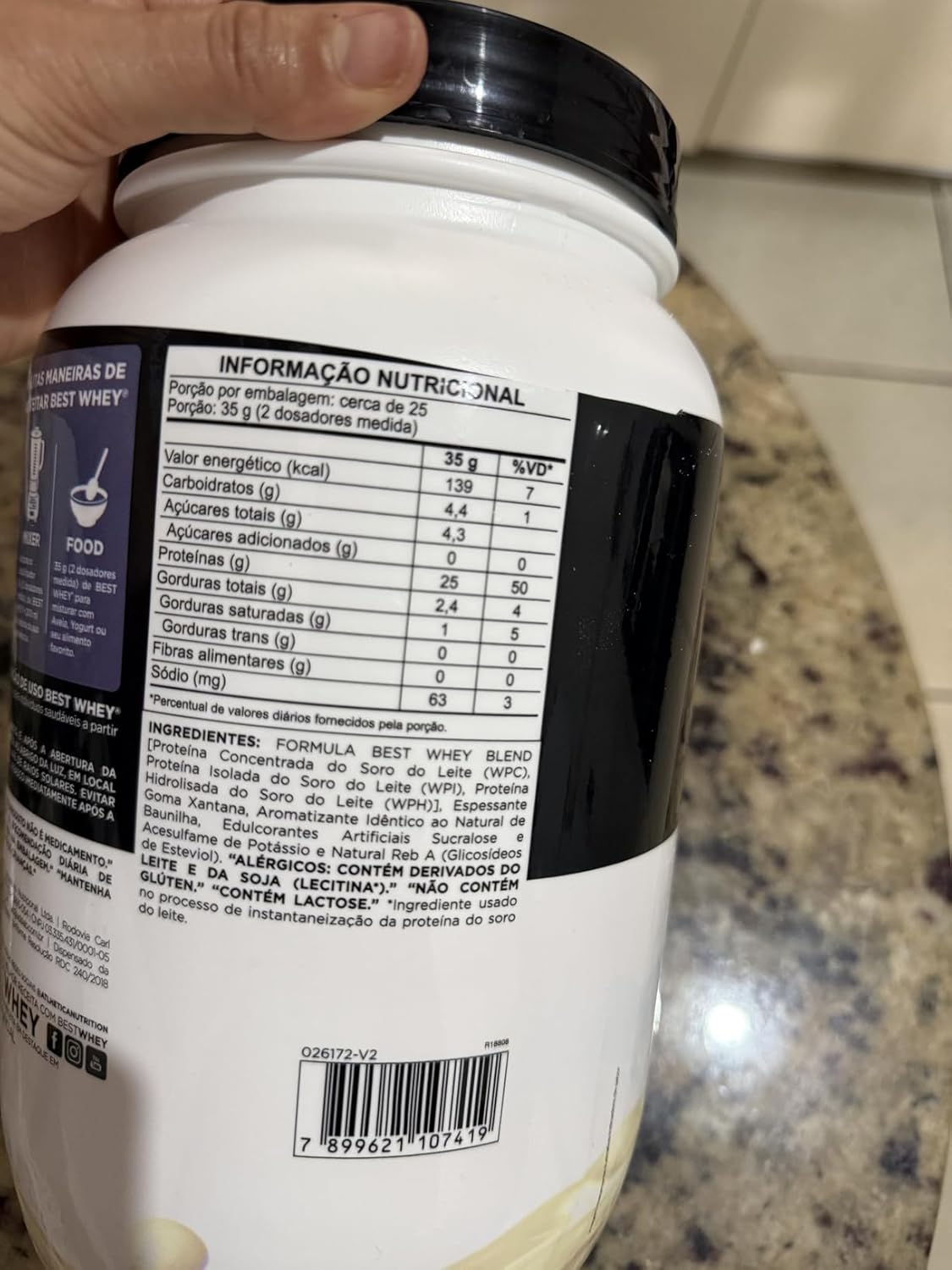 Veio certinho.É o único whey que consumo, por conta do sabor bom, não é enjoativo e não tem aquele gosto residual que empreguina na boca.Veio lacrado, com lacre de fora e o de vedação entre a tampa e o pote, validade boa de mais de um ano, quantidade normal, textura e cheiro igual aos que já consumi. O pote tem uma cor um pouco mais clara que o último que tinha aqui e comparei, mas imagino que ocorra variação da embalagem mesmo de lote pra lote. Atrasou um dia do previsto, mas tudo bem.Valeu a compra, valor melhor que o do site deles, comprarei mais vezes.