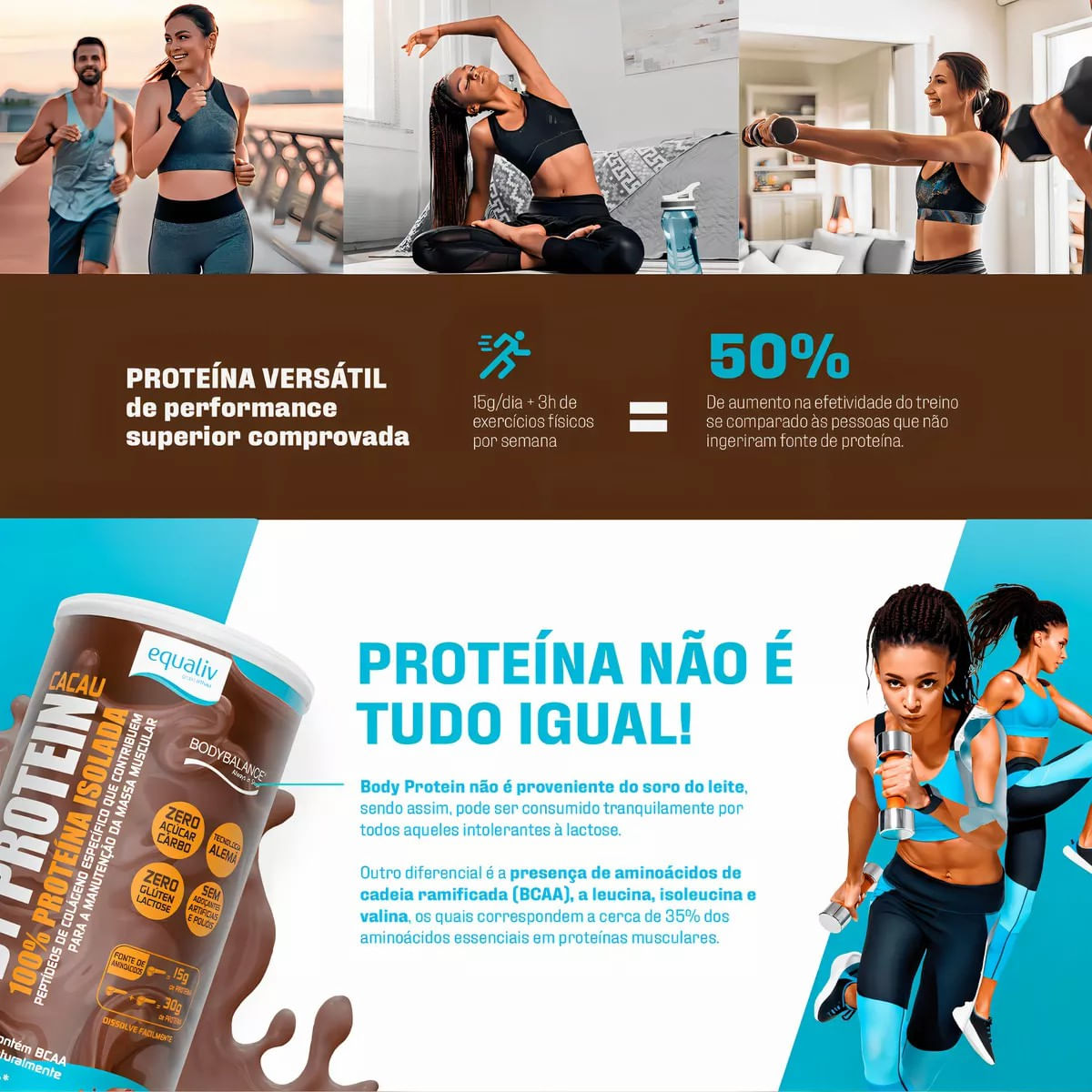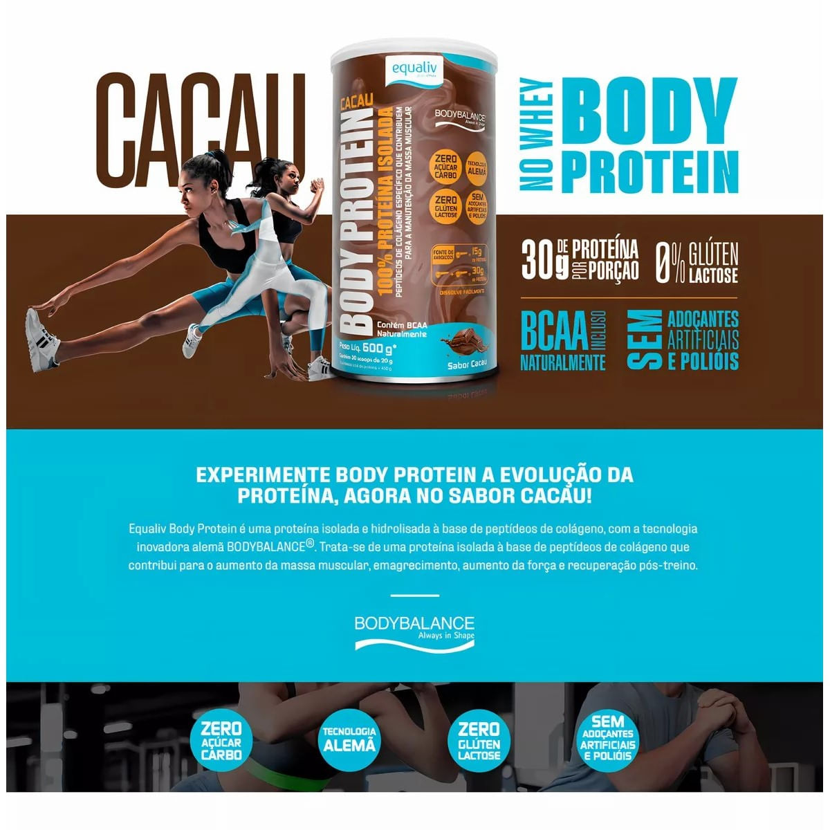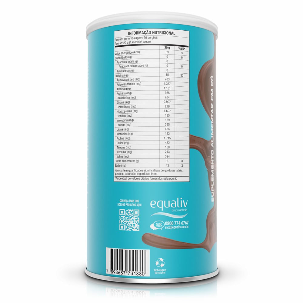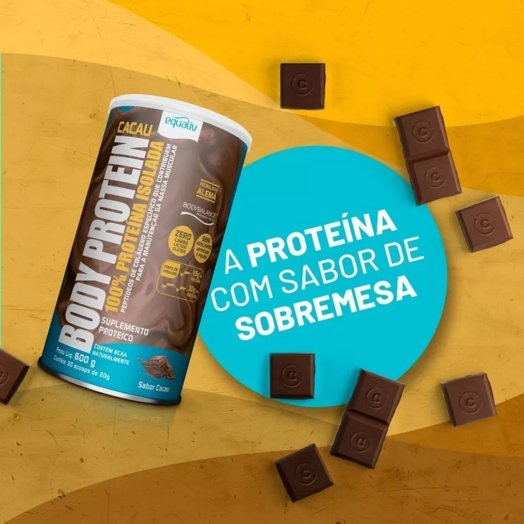 Equaliv Body Protein Cacau é um produto da família Body Protein, agora com um delicioso sabor vanilla. Equaliv Body Protein Cacaué uma proteína isolada com tecnologia, a base de peptídeos de colágeno específico para os músculos. Body Protein não é proveniente do soro do leite, sendo assim, pode ser consumido tranquilamente por todos aqueles intolerantes à lactose. Outro diferencial é a presença de aminoácidos de cadeia ramificada (BCAA), a leucina, isoleucina e valina, os quais correspondem a cerca de 35% dos aminoácidos essenciais em proteínas musculares. Estudo mostra que 15g/dia + 3h de exercícios físicos por semana resultam em 50% de aumento na efetividade do treino, se comparado às pessoas que não ingeriram fonte de proteína.