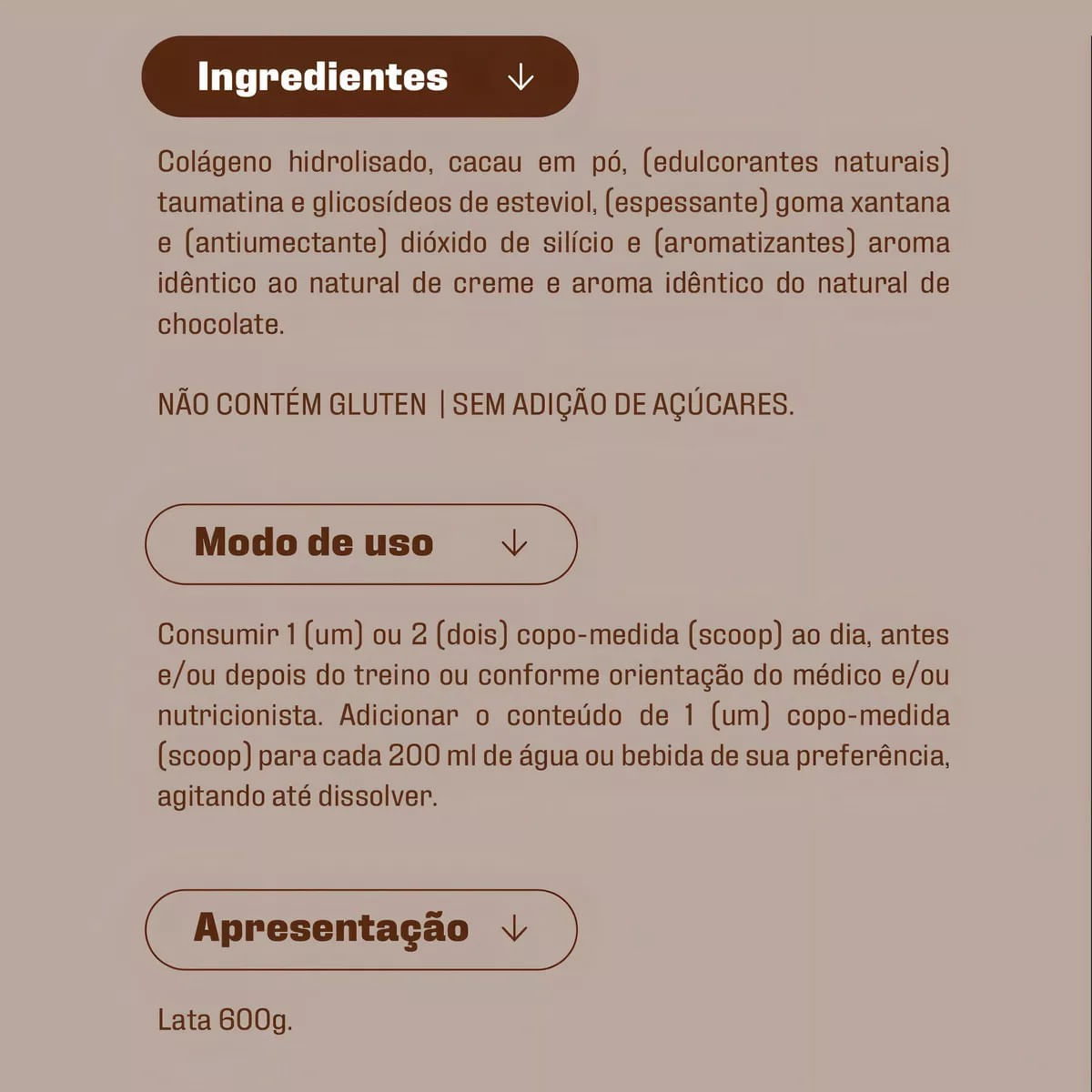 Colágeno hidrolisado, cacau em pó, (edulcorantes naturais) taumatina e glicosídeos de esteviol, (espessante) goma xantana e (antiumectante) dióxido de silício e (aromatizantes) aroma idêntico ao natural de creme e aroma idêntico do natural de chocolate.