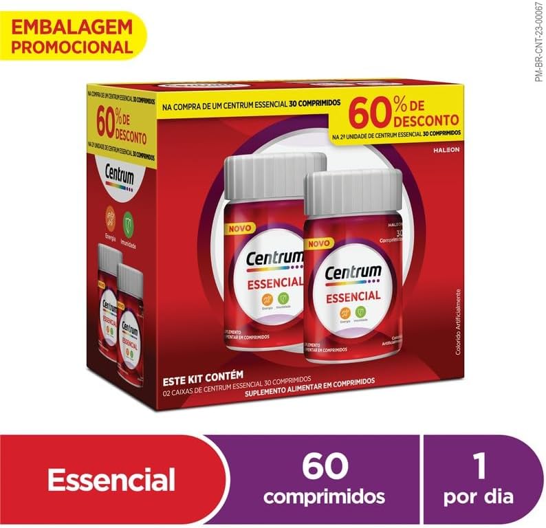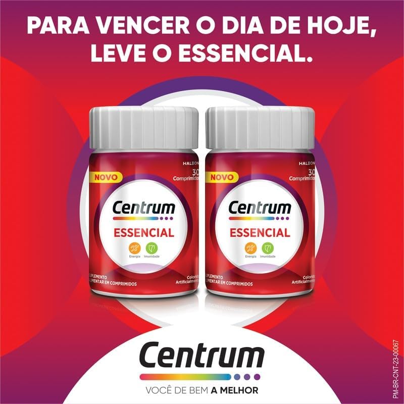 O Centrum Essencial é o suplemento vitaminico para as necessidades dos brasileiros, trazendo nutrientes essenciais para a energia. Com 7 vitaminas e 1 mineral, este polivitaminico é formulado para trabalhar nas principais carências nutricionais da população. Livre de glúten, açúcares e colesterol, o Centrum Essencial vem em embalagem com 30 comprimidos trazendo uma combinação de vitamina C, vitamina B6 e outros nutrientes. A vitamina C é essencial para combater os radicais livres e para o metabolismo energético. Modo de uso: ingerir 1 comprimido ao dia. Invista na sua saúde com o Centrum Essencial, o multivitamínico que cuida de você de dentro para fora. Adquira já e potencialize sua imunidade e energia!