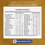 Ingredientes: Leite integral, concentrado proteico de soro de leite, maltodextrina, minerais (citrato de cálcio, sais de magnésio do ácido cítrico, pirofosfato férrico, sulfato de zinco, sulfato de manganês, sulfato de cobre e selenato de sódio), proteína de soja isolada, polidextrose, caseinato de cálcio, colágeno hidrolisado, enzima lactase, vitaminas (L-ascorbato de sódio, acetato de DL-alfa tocoferila, nicotinamida, D-pantotenato de cálcio, cloridrato de piridoxina, tiamina mononitrato, acetato de retinila, riboflavina, ácido N-pteroil-L-glutâmico, fitomenadiona, colecalciferol, D biotina e cianocobalamina), reguladores de acidez citrato de potássio, hidróxido de potássio e ácido cítrico e emulsificante lecitina.