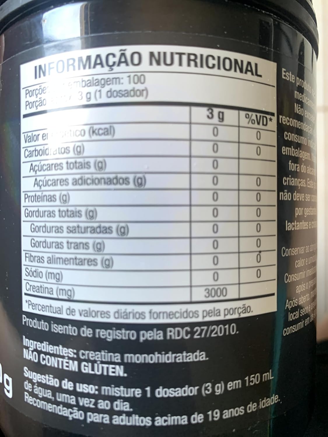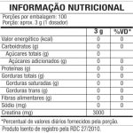 - -Creatina monohidratada; pode conter leite, ovo, amendoim, soja e derivados; não contém glúten