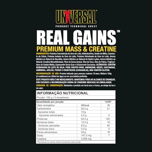 - Hipercalórico Completo com Creatina – Real Gains combina proteínas de alto valor biológico, carboidratos complexos, gorduras saudáveis e creatina monohidratada, oferecendo suporte total para quem busca crescimento muscular, força e recuperação.