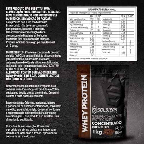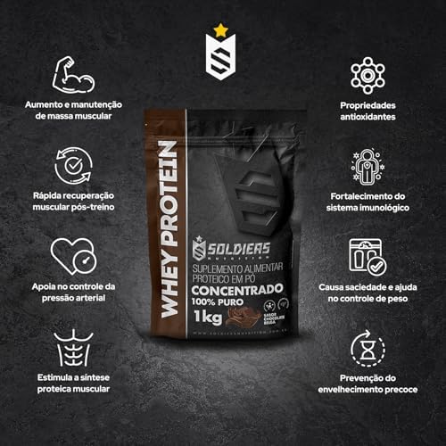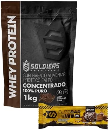 Kit: Whey Protein 1Kg Chocolate Belga + Barrinha Elitebar Pão de Mel 30g Soldiers Nutrition O Whey Protein Concentrado 60% da Soldiers Nutrition oferece excelente custo-benefício, com 30 g de proteína por dose e fórmula própria desenvolvida para garantir alta qualidade, cremosidade e sabor superior. O produto passa por rígido controle de produção, resultando em um suplemento sem retrogosto e com textura agradável. O diferencial Soldiers Nutrition O sabor é um dos principais destaques. As fórmulas são constantemente aprimoradas para proporcionar uma experiência mais suave, sem amargor e com ótima dissolução. O que é e para que serve o Whey Protein? O whey protein é um suplemento amplamente utilizado por praticantes de atividade física por contribuir para a recuperação após o treino e para o desenvolvimento muscular. Ele é rico em aminoácidos essenciais, facilmente absorvidos pelo organismo, atuando diretamente nas fibras musculares. Também pode ser indicado para diferentes públicos, como idosos e vegetarianos, sempre com orientação de um profissional de saúde. Como usar o Whey Protein O whey protein é versátil e pode ser misturado em água, leite, sucos ou utilizado no preparo de receitas saudáveis. Sua textura cremosa facilita o consumo em shakes e preparos rápidos, como mousses e vitaminas. Informação Nutricional Porções por embalagem: 20 Porção: 50 g (2 medidas dosadoras) Auxilia na recuperação após treinos intensos. Contribui para o desenvolvimento e manutenção da massa muscular. Fornece 30 g de proteína por porção. Possui boa dissolução e textura cremosa. Pode ser utilizado em shakes e receitas saudáveis.