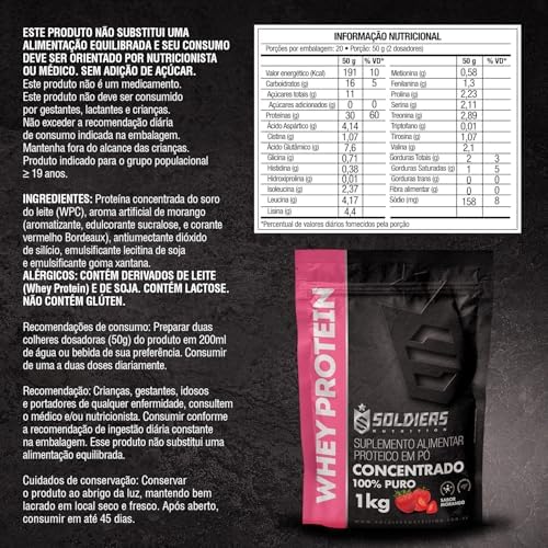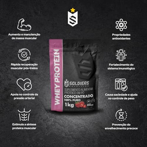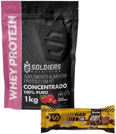 Kit: Whey Protein 1Kg Morango + Barrinha Elitebar Pão de Mel 30g Soldiers Nutrition O Whey Protein Concentrado 60% da Soldiers Nutrition oferece excelente custo-benefício, com 30 g de proteína por dose e fórmula própria desenvolvida para garantir alta qualidade, cremosidade e sabor superior. O produto passa por rígido controle de produção, resultando em um suplemento sem retrogosto e com textura agradável. O diferencial Soldiers Nutrition O sabor é um dos principais destaques. As fórmulas são constantemente aprimoradas para proporcionar uma experiência mais suave, sem amargor e com ótima dissolução. O que é e para que serve o Whey Protein? O whey protein é um suplemento amplamente utilizado por praticantes de atividade física por contribuir para a recuperação após o treino e para o desenvolvimento muscular. Ele é rico em aminoácidos essenciais, facilmente absorvidos pelo organismo, atuando diretamente nas fibras musculares. Também pode ser indicado para diferentes públicos, como idosos e vegetarianos, sempre com orientação de um profissional de saúde. Como usar o Whey Protein O whey protein é versátil e pode ser misturado em água, leite, sucos ou utilizado no preparo de receitas saudáveis. Sua textura cremosa facilita o consumo em shakes e preparos rápidos, como mousses e vitaminas. Informação Nutricional Porções por embalagem: 20 Porção: 50 g (2 medidas dosadoras) Auxilia na recuperação após treinos intensos. Contribui para o desenvolvimento e manutenção da massa muscular. Fornece 30 g de proteína por porção. Possui boa dissolução e textura cremosa. Pode ser utilizado em shakes e receitas saudáveis.