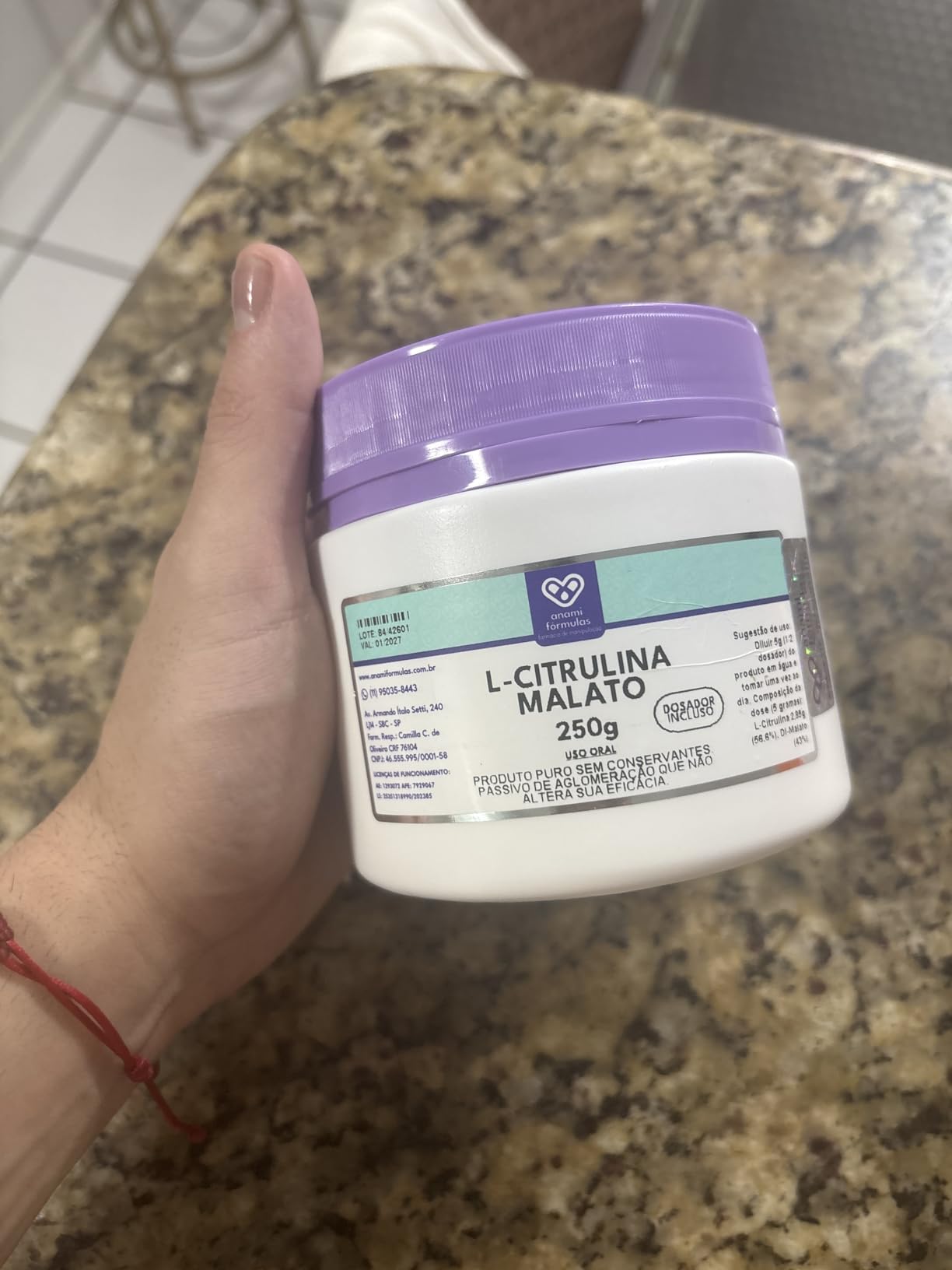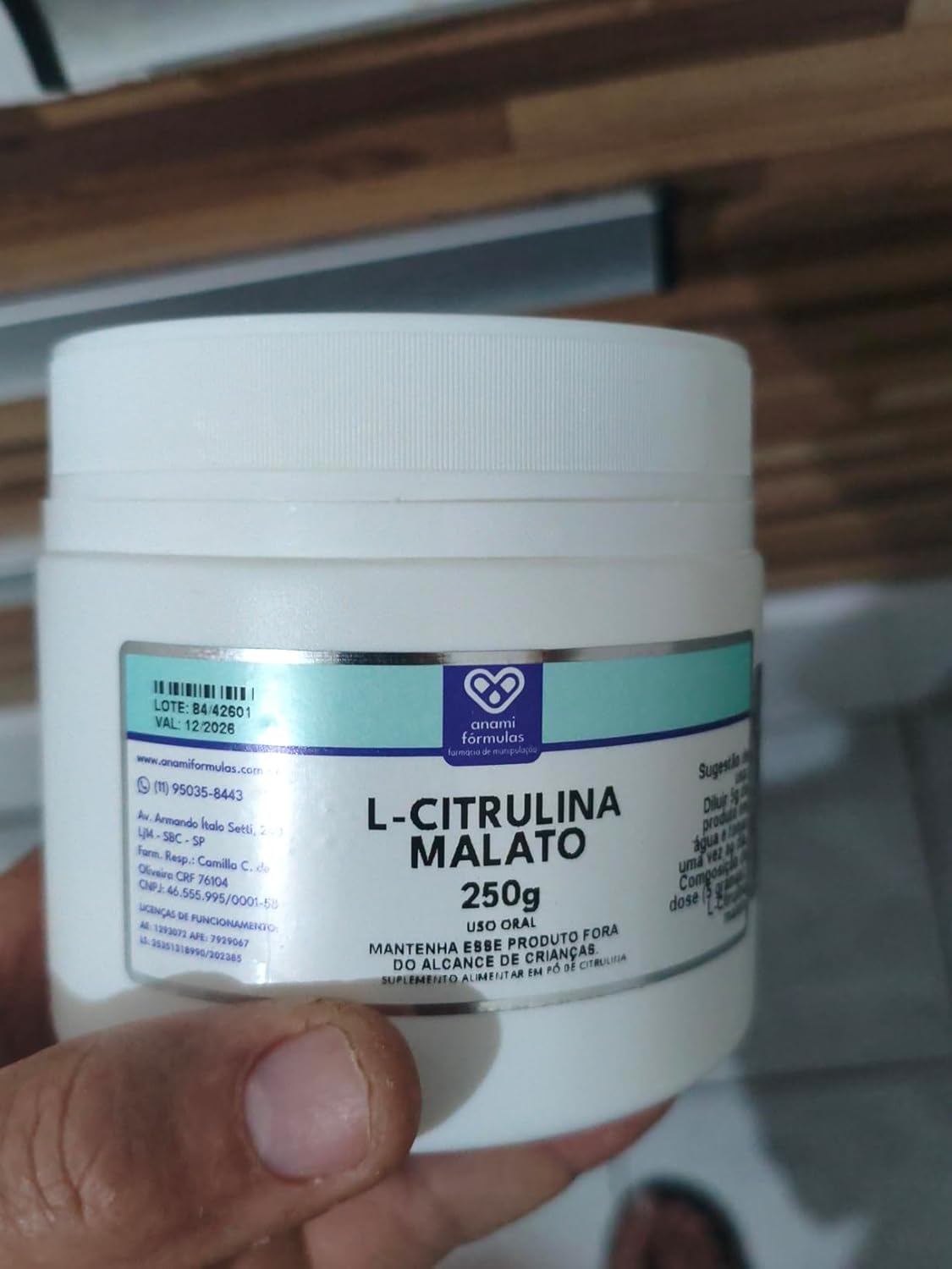 Na Anami, acreditamos que saúde e bem-estar andam lado a lado com confiança e qualidade. Por isso, cada produto nasce do cuidado farmacêutico, de matérias-primas certificadas e de processos seguros, pensados para quem busca viver mais e melhor. Citrulina Malato 250 g Composição Citrulina Malato Pura – 250 g. Como usar A indicação ideal deve vir do seu médico ou nutricionista. Em uso geral, recomenda-se diluir 1 dose em 200 ml de água, consumindo antes da prática de exercícios físicos. Horário sugerido Preferencialmente 30 a 60 minutos antes do treino, salvo orientação diferente do profissional de saúde. Atenção Suplemento alimentar não é medicamento. Evite automedicação. Gestantes, lactantes, pessoas com doenças crônicas ou em uso de medicamentos devem consultar médico ou farmacêutico antes do uso. Imagens meramente ilustrativas; prevalecem as informações do rótulo. Avisos importantes Uso indicado para maiores de 18 anos. Pode ser consumido junto das refeições, se recomendado.