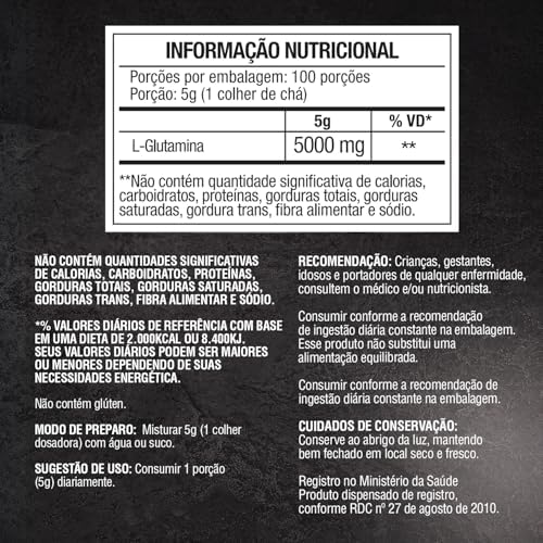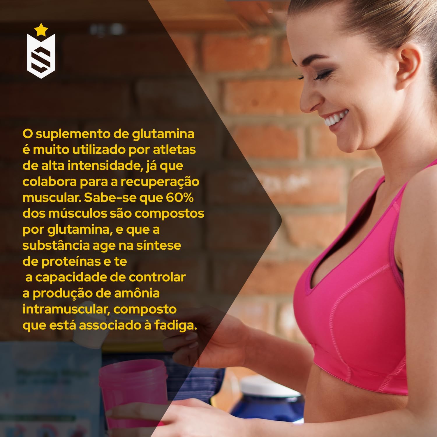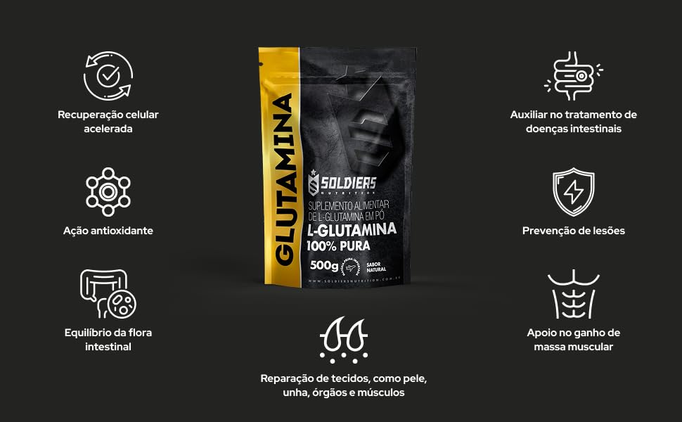 - L-Glutamina 500g - 100% Pura Importada - Soldiers NutritionAcompanha Colher Dosadora 5gA glutamina é a proteína mais abundante no nosso corpo e é sintetizada a partir das necessidades do organismo. Esse aminoácido corresponde a 20% do total de aminoácidos e essa quantidade é 2 vezes maior que a alanina. Ela é desenvolvida a partir de 3 substâncias: ácido glutâmico (o grupo amida), valina e isoleucina. Para ser metabolizada, duas enzimas são necessárias sendo uma delas a glutamina sintetase, fazendo a interação do glutamato com a amônia e a outra, é a glutaminase. A síntese da glutamina ocorre, em primeiro lugar e principalmente, nos músculos.
