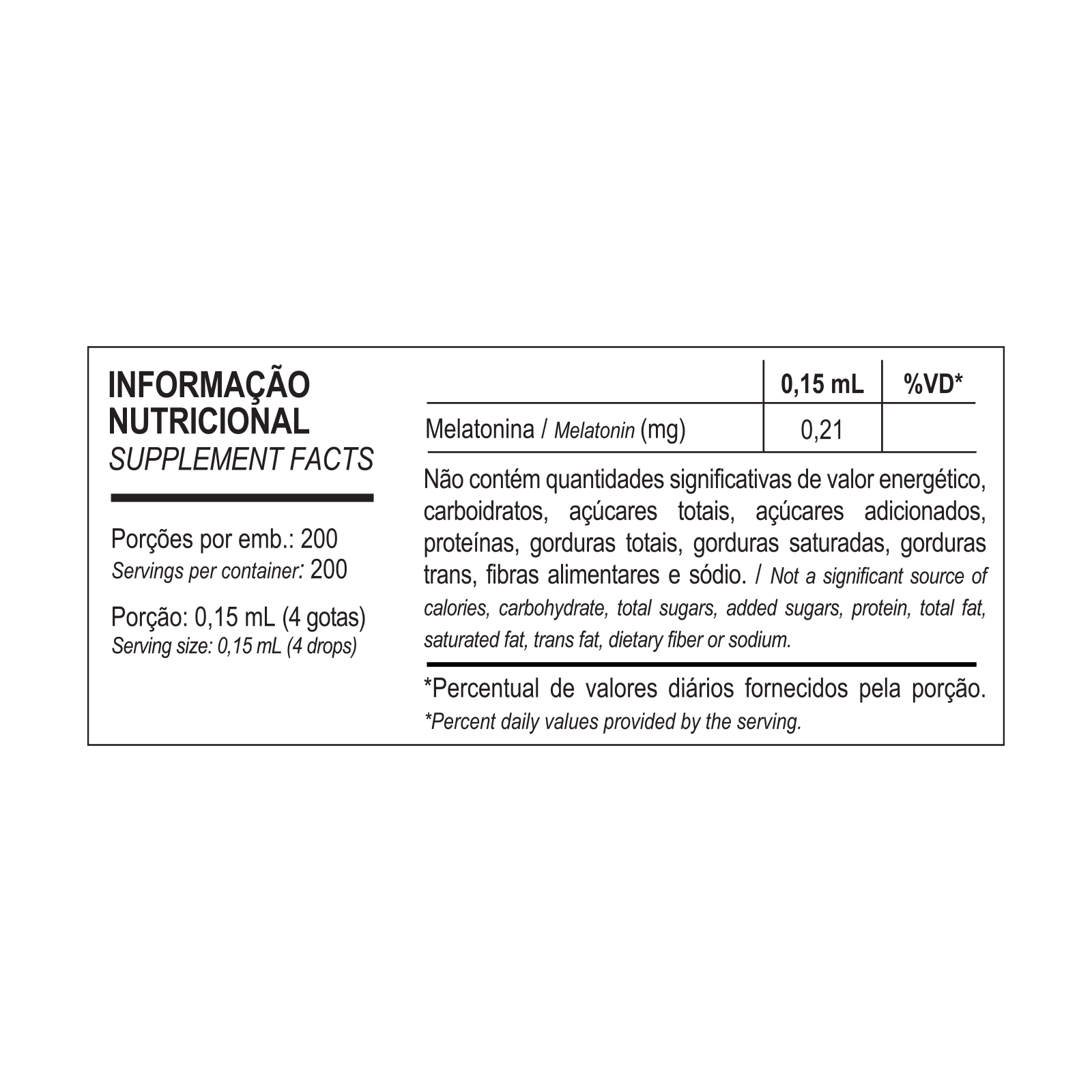 Água purificada, melatonina, umectante glicerina, aromatizante, conservadores sorbato de potássio e benzoato de sódio e regulador de acidez ácido cítrico. Não contém glúten.