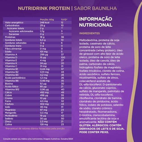O amadurecimento saudável é essencial para manter uma vida ativa e plena. Nutridrink Protein Baunilha é um aliado importante para apoiar seu bem-estar diário. Muitas pessoas não consomem a quantidade necessária de proteínas, vitamina D e cálcio em suas dietas, o que pode afetar a saúde e a qualidade de vida⁴-⁹. Nutridrink Protein possui 18g de proteínas por porção, auxiliando na manutenção e recuperação muscular para manter a força e vitalidade¹-⁹. Cada porção fornece 100% da recomendação diária de vitamina D⁴-⁹, fundamental para a saúde óssea e função muscular, além de fortalecer o sistema imunológico⁴-⁹. Este suplemento também é rico em cálcio e possui baixo teor de gorduras saturadas, tornando-se uma escolha saudável para o dia a dia. BULLET POINTS – 18G DE PROTEÍNAS POR PORÇÃO: Ajuda a manter a força e a vitalidade muscular¹-⁴,⁸. – 100% DA RECOMENDAÇÃO DIÁRIA DE VITAMINA D: Saúde óssea, função muscular e fortalecimento imunológico⁴-⁹. – CÁLCIO EM SUA COMPOSIÇÃO: Contribui para ossos fortes e saudáveis⁴-⁹. – BAIXO TEOR DE GORDURAS SATURADAS: Uma escolha saudável. – FÓRMULA ZERO LACTOSE: Opção para intolerantes à lactose. Ingredientes Maltodextrina, proteína de soja isolada, caseinato de cálcio, proteína de soro de leite concentrada (whey protein), óleo de girassol com alto teor de ácido oleico, proteína de soro de leite isolada, óleo de canola, óleo de palma, carbonato de cálcio, hidrogênio fosfato de magnésio, fosfato tricálcico, cloreto de colina, ácido ascórbico, sulfato ferroso, nicotinamida, sulfato de zinco, colecalciferol, acetato de DL-alfa-tocoferol, D-pantotenato de cálcio, gluconato cúprico, sulfato de manganês, palmitato de retinila, DL-alfa-tocoferol, riboflavina, cloridrato de tiamina, cloridrato de piridoxina, ácido fólico, iodato de potássio, selenito de sódio, cloreto crômico hexaidratado, fitomenadiona, D-biotina, cianocobalamina e emulsificante lecitina de soja. *Vitalidade está associada ao consumo de nutrientes que contribuem com o ganho de força, disposição e imunidade presentes na formulação de Nutridrink, junto a uma rotina de hábitos saudáveis. O PRODUTO MENCIONADO NÃO CONTÉM GLÚTEN. Consulte sempre seu médico e/ou nutricionista. Referências 1. Bauer, J Et al Evidence-Based Recommendations for Optimal Dietary Protein Intake in Older People: A Position Paper From the PROT-AGE Study Group. JAMDA 14 (2013). 2. Cruz-Jentoft AJ, Sayer AA. Sarcopenia. Lancet 2019; Jun 29; 393(10191): 2636-2646. 3. Paddon, J et al. Dietary recommendations and the prevention of sarcopenia: Protein, amino acid metabolism and therapy. Curr Nutr Metab Care 2009 12 1 86 90 4. Diretriz Braspen de Terapia Nutricional no Envelhecimento BRASPENJ 2019 34 (Supl 3) 2-58. 5. Vannucchi H, Rocha MM, Takeuchi PL. Funções Plenamente Reconhecidas de Nutrientes – Vitamina C / ILSI Brasil, 2018. 6. Giudici KV, Peters BSE, Martini LA. Funções Plenamente Reconhecidas de Nutrientes – Vitamina D / ILSI Brasi, 2018. 7. Cominetti Z, Reis BZ, Cozzolino SMF. Funções Plenamente Reconhecidas de Nutrientes – Zinco / ILSI Brasil, 2017. 8. Brandão CFC, et al. Funções Plenamente Reconhecidas de Nutrientes – Proteína / ILSI Brasil, 2019. 9. França NAGF, Martini LA. Funções Plenamente Reconhecidas de Nutrientes – Cálcio / ILSI Brasil, 2018.