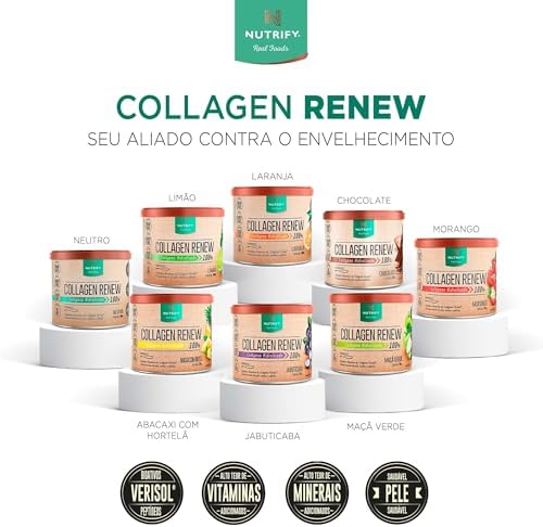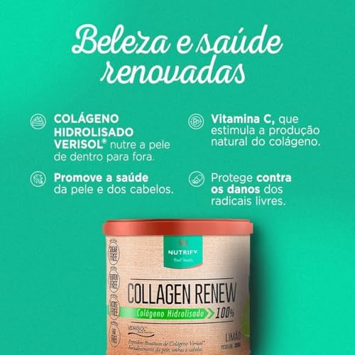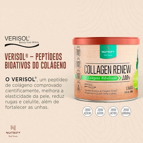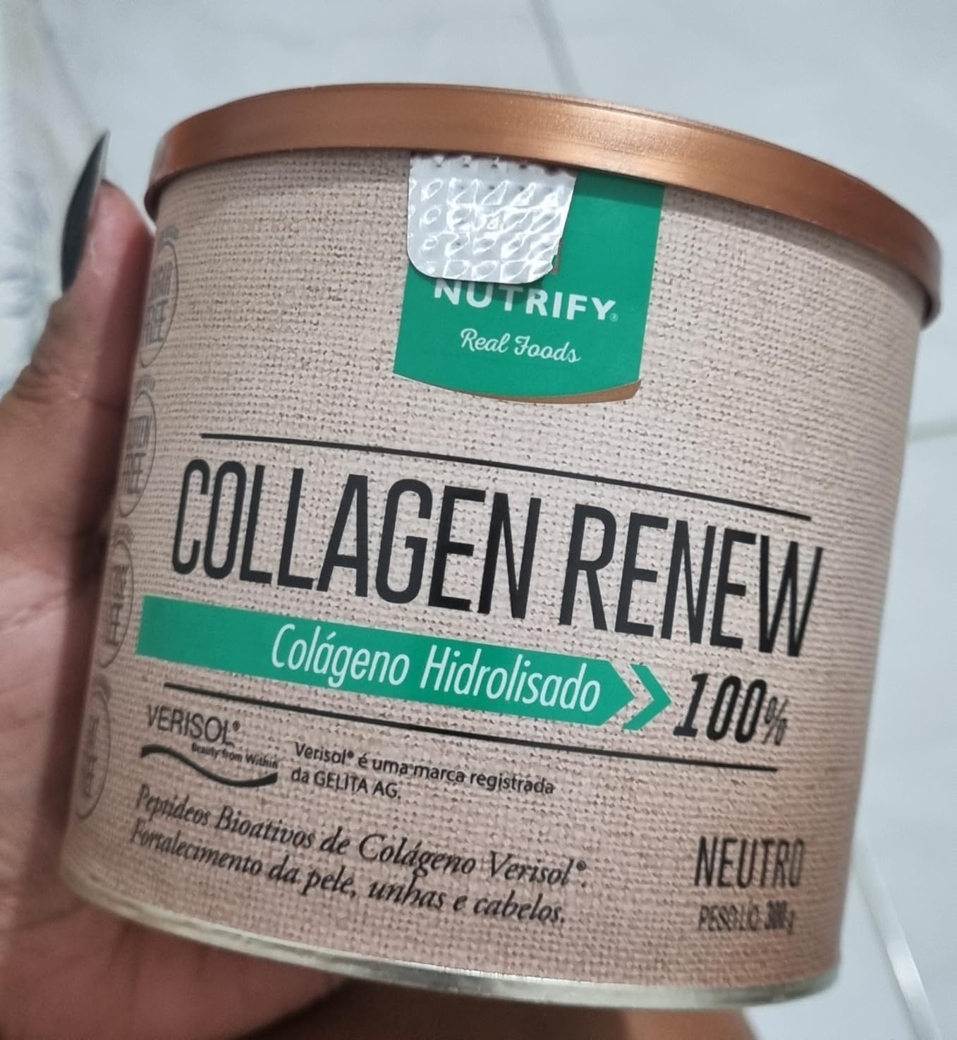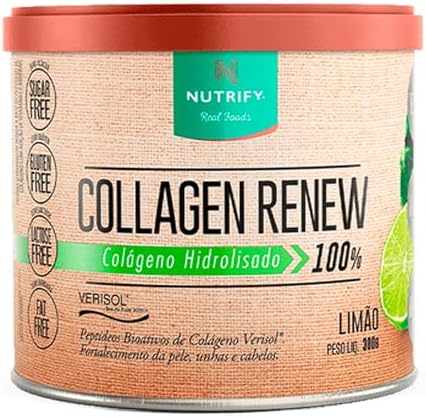 • A firmeza e a sustentação de nossa pele estão diretamente relacionadas à produção de colágeno pelo organismo, que diminui progressivamente ao longo dos anos, ocasionando flacidez e outros sinais de envelhecimento. À base de colágeno hidrolisado, a fórmula de COLLAGEN RENEW Nutrify oferta também 2,5 g de peptídeos bioativos de colágeno Verisol em cada porção, ajudando a recuperar a firmeza dos tecidos, melhorando sua aparência. COLLAGEN RENEW Nutrify é isento de açúcar, lactose, glúten, corantes e adoçantes artificiais, e conta com adição de vitaminas e minerais antioxidantes, que favorecem a absorção dos peptídeos e promovem o fortalecimento de unhas e cabelos.