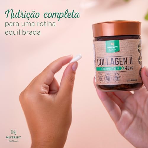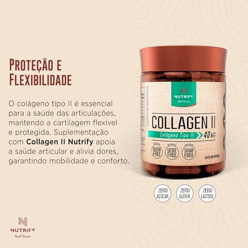 - A saúde de nossas articulações e nossa mobilidade estão ligadas aos níveis de colágeno tipo II presentes em nosso corpo, que diminuem com o passar dos anos. Collagen II Nutrify oferta esses peptídeos em sua forma pura, adicionada de vitaminas antioxidantes (B1, B3, B6, C e E), que favorecem sua absorção. Collagen II Nutrify não contém açúcar, lactose, glúten e adoçantes artificiais