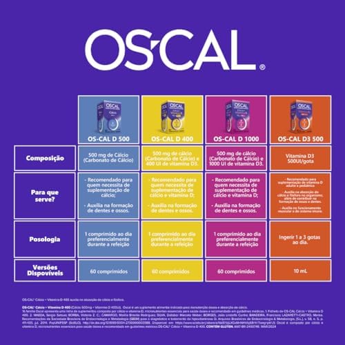 OS-CAL D 400UI é um suplemento alimentar indicado para adultos (a partir de 19 anos), gestantes e lactantes que necessitam de suplementação de cálcio e vitamina D⁶. Possui em sua composição 500mg de cálcio e 400UI de vitamina D¹ (Colecalciferol). Está disponível na versão com 60 comprimidos revestidos e recomenda-se o uso de 1 comprimido ao dia¹.