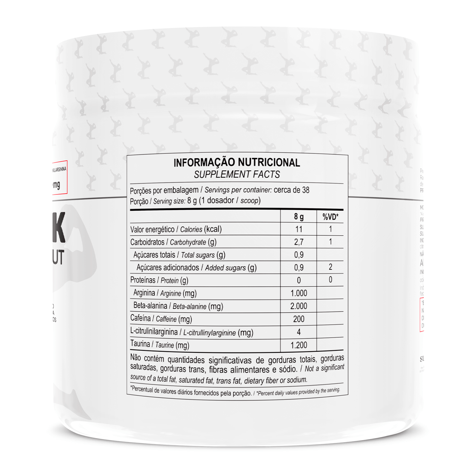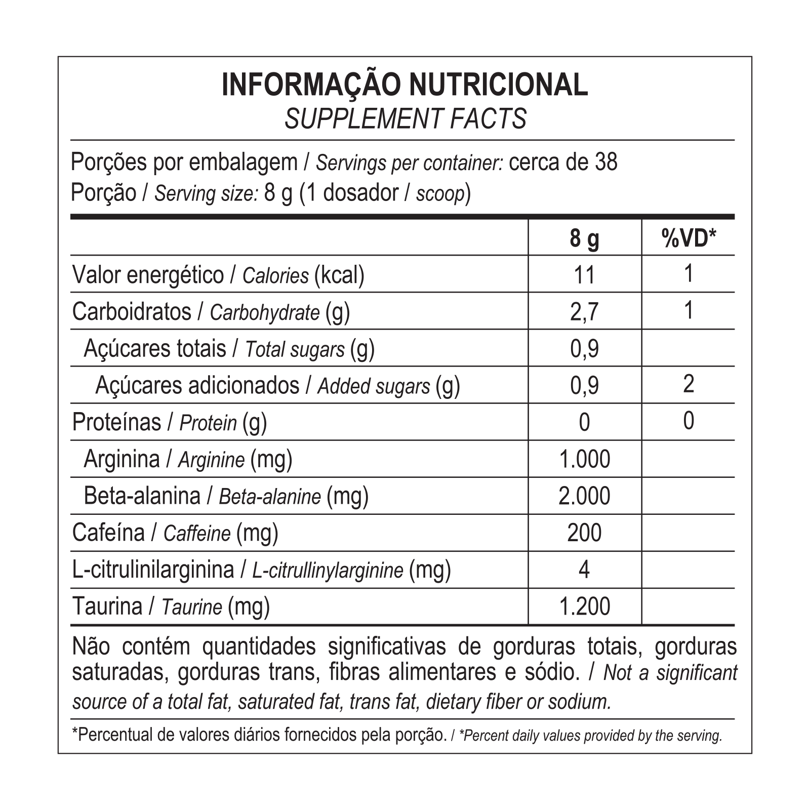 Com 2.000mg de Beta Alanina, 1.000mg de Arginina, 1.200mg de Taurina, 4mg de L-citrulinilarginina e 200mg de cafeína.