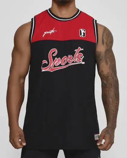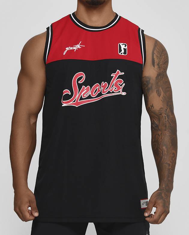 - COLEÇÃO GROWTH SPORTS- - REGATA GROWTH SPORTS G9 PRETA/VERMELHA - COMPOSIÇÃO 100% POLIÉSTER TRAMADO LEVE ACABAMENTO EM RIBANA ESTAMPA EM SUBLIMAÇÃO DIGITAL