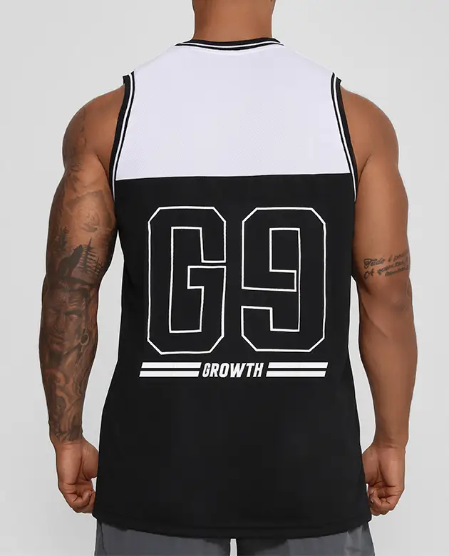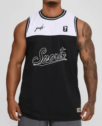 - COLEÇÃO GROWTH SPORTS- - REGATA GROWTH SPORTS G9 PRETO/BRANCO - COMPOSIÇÃO 100% POLIÉSTER TRAMADO LEVE ACABAMENTO EM RIBANA ESTAMPA EM SUBLIMAÇÃO DIGITAL