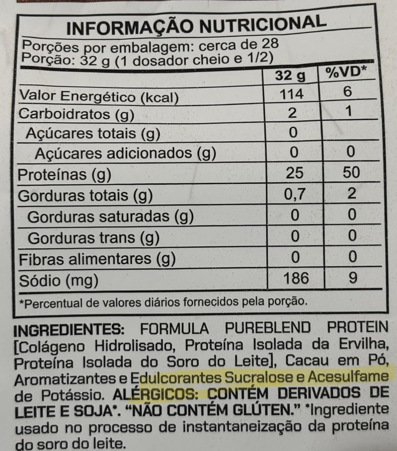 Pure Blend 100% Protein: uma fórmula premium desenvolvida para quem busca alto desempenho, saúde integral e uma nutrição limpa, eficaz e completa. Sendo zero lactose. Essa composição oferece suporte completo para quem busca performance, longevidade e uma alimentação rica em nutrientes funcionais. Perfeito para quem prefere fórmulas mais leves e tolerantes. Uma opção inclusiva para diferentes perfis de consumidores e estilos de vida. Feito com ingredientes selecionados, sem glúten, corantes artificiais ou aditivos. Pure Blend entrega um sabor natural e agradável, perfeito para sua rotina. Cada porção entrega 25g de proteína de alta qualidade, combinando: Proteína Isolada da Ervilha – fonte vegetal nobre, com excelente perfil nutricional e leve para o organismo. Proteína Isolada do Soro do Leite (Whey Isolate) – padrão ouro em pureza e absorção. Colágeno Hidrolisado – aliado na manutenção da firmeza da pele, cabelo e unhas. Benefícios: Alta concentração de proteína por dose Apoio à recuperação pós-atividade física Fórmula leve, ideal para quem tem restrições alimentares Pele mais nutrida, unhas e cabelo mais resistentes Ideal para dietas equilibradas: sem adição de açúcares e com baixo teor de carboidratos Pode ser consumido com água, bebidas vegetais ou incluído em receitas práticas Sugestão de Uso: Adicione em sua coqueteleira 32g (1 dosador e meio) em 200ml de água ou bebida de sua preferência, e agite. Pode ser utilizado em receitas.